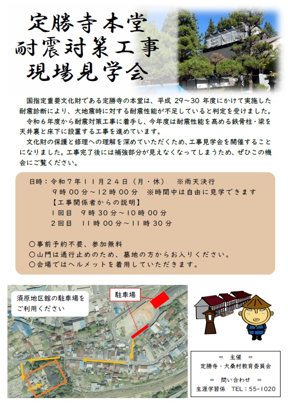| 内容 | 文化財の保護と修理への理解を深めていただくため、定勝寺本堂耐震対策工事現場見学会を開催します。