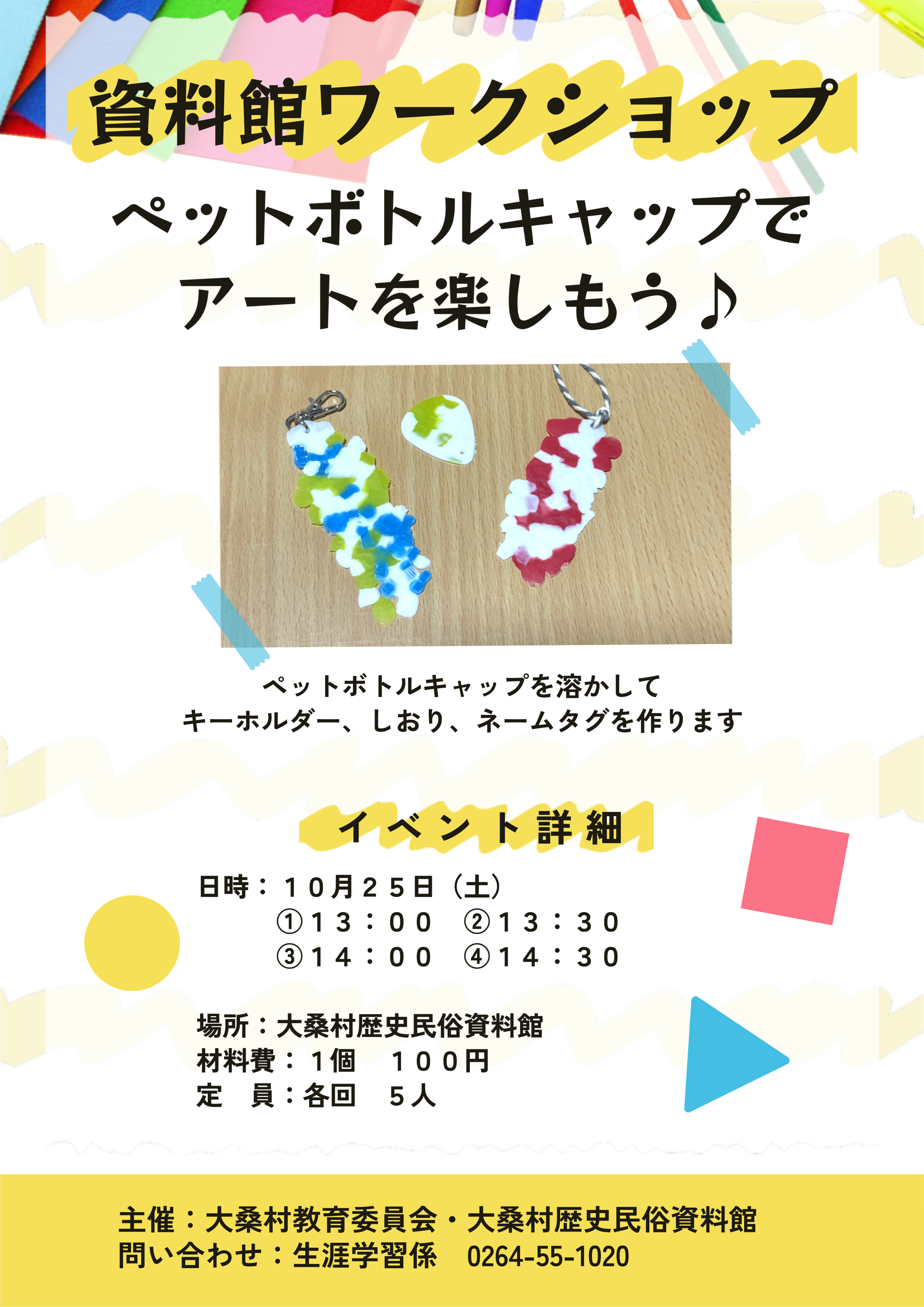 内容 | 資料館イベント2025【もりさとワークショップ】を開催します! ペットボトルキャップを溶かしてキーホルダーやネームタグ、しおりを作ります。