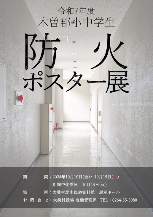 | 木曽郡小中学生 防火ポスター展 | 2025年10月10日~19日 | 木曽郡内の小中学生が制作した防火ポスターの巡回展です。 | チラシ(117.3kbyte) |