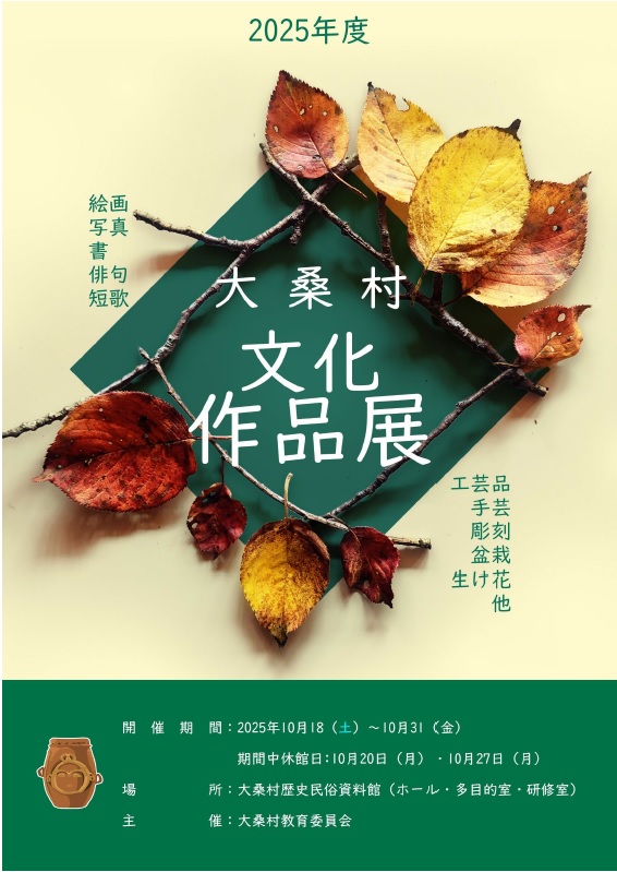 | 大桑村文化作品展 | 2025年10月18日~31日 | 生涯学習教室やサークル活動、個人制作の作品を展示します。 | チラシ(128.5kbyte) |
