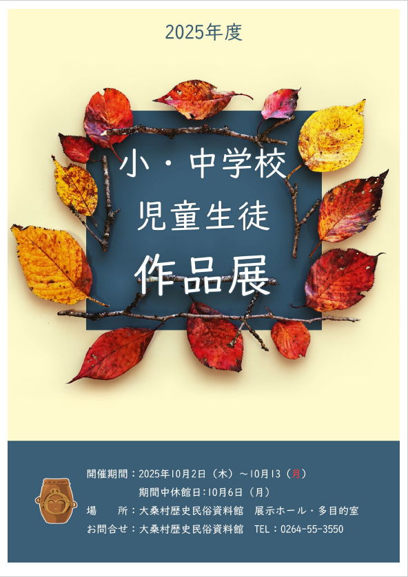 | 小・中学校児童生徒作品展 | 2025年10月2日~13日 | 大桑小学校、大桑中学校の児童・生徒の作品を展示します。 | チラシ(514.4kbyte) |