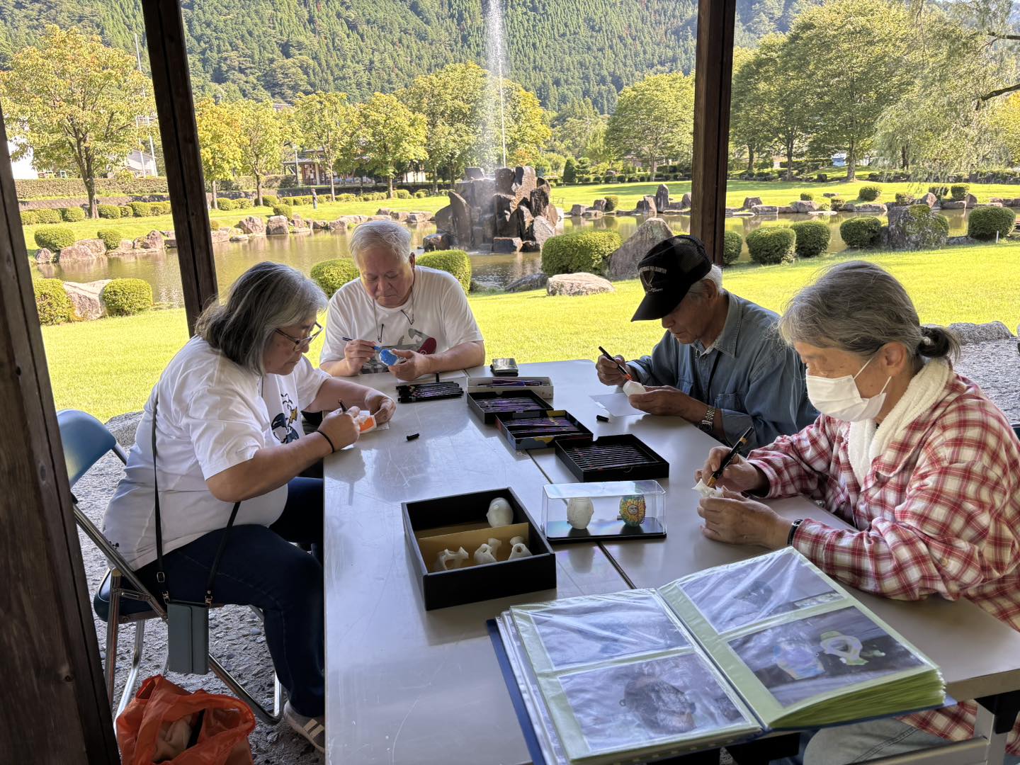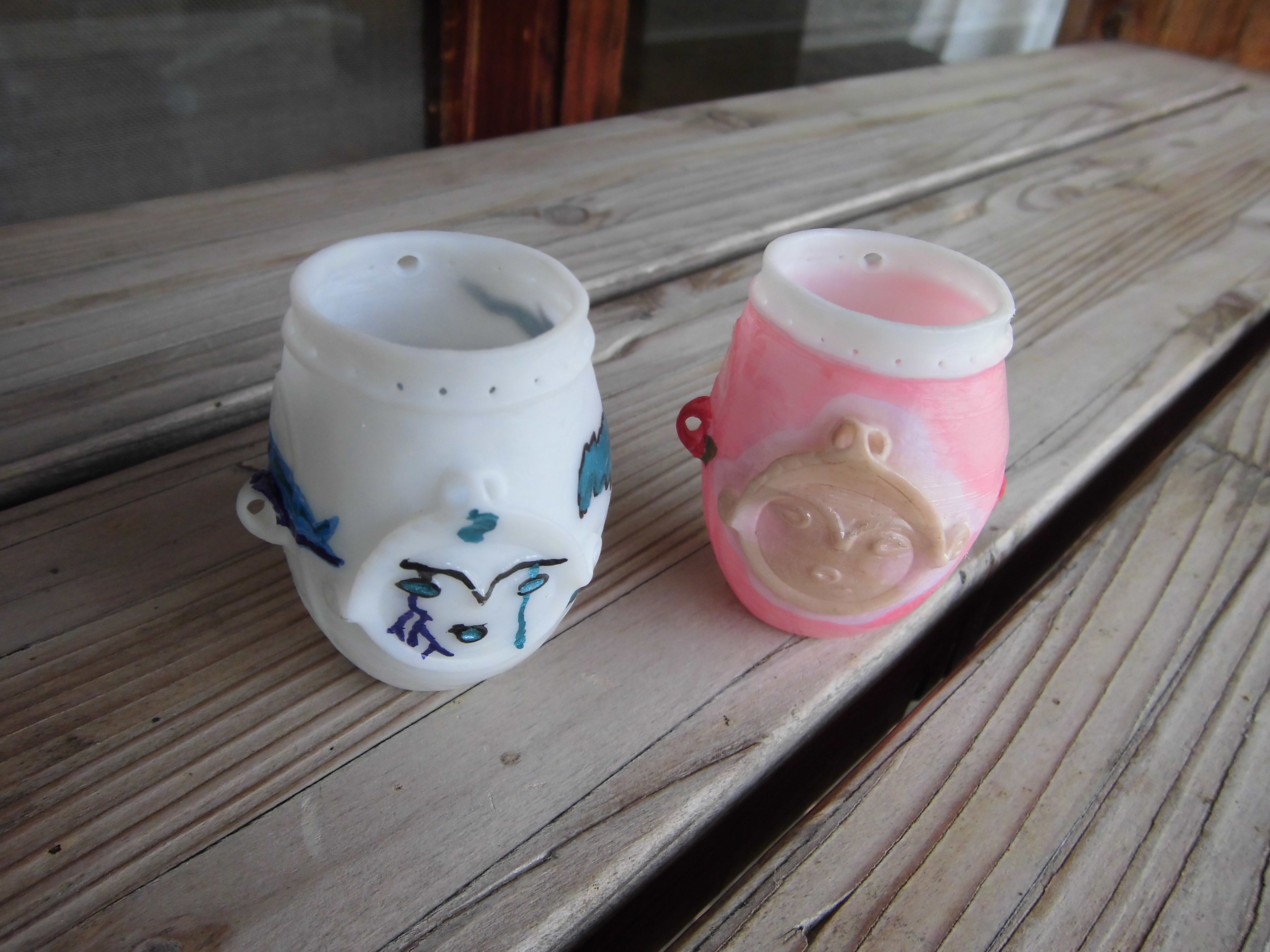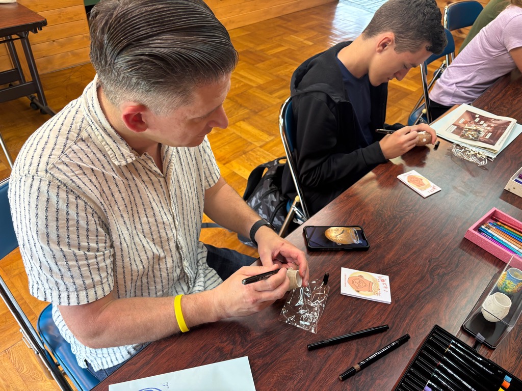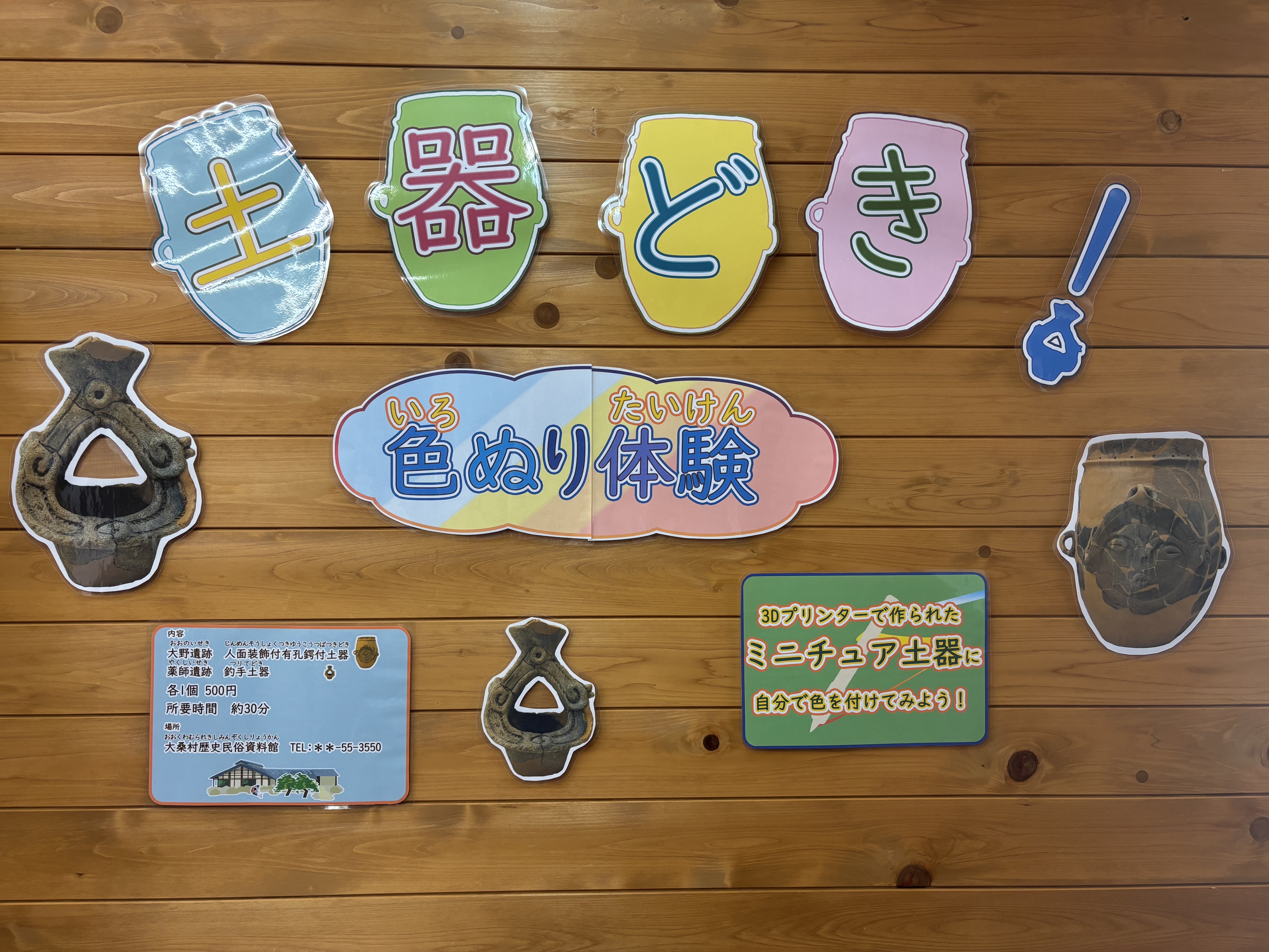 大桑村で出土した人面装飾付有孔鍔付土器(愛称:悠久のほほ笑み)と釣手土器のミニチュア土器の色ぬり体験を行っています♪