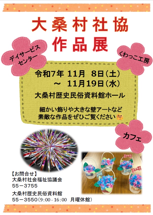 | 大桑村社協作品展 | 2025年11月8日~19日 | デイサービス、くわっこ工房、カフェの皆さんによる作品展です。 | チラシ(195.4kbyte) |