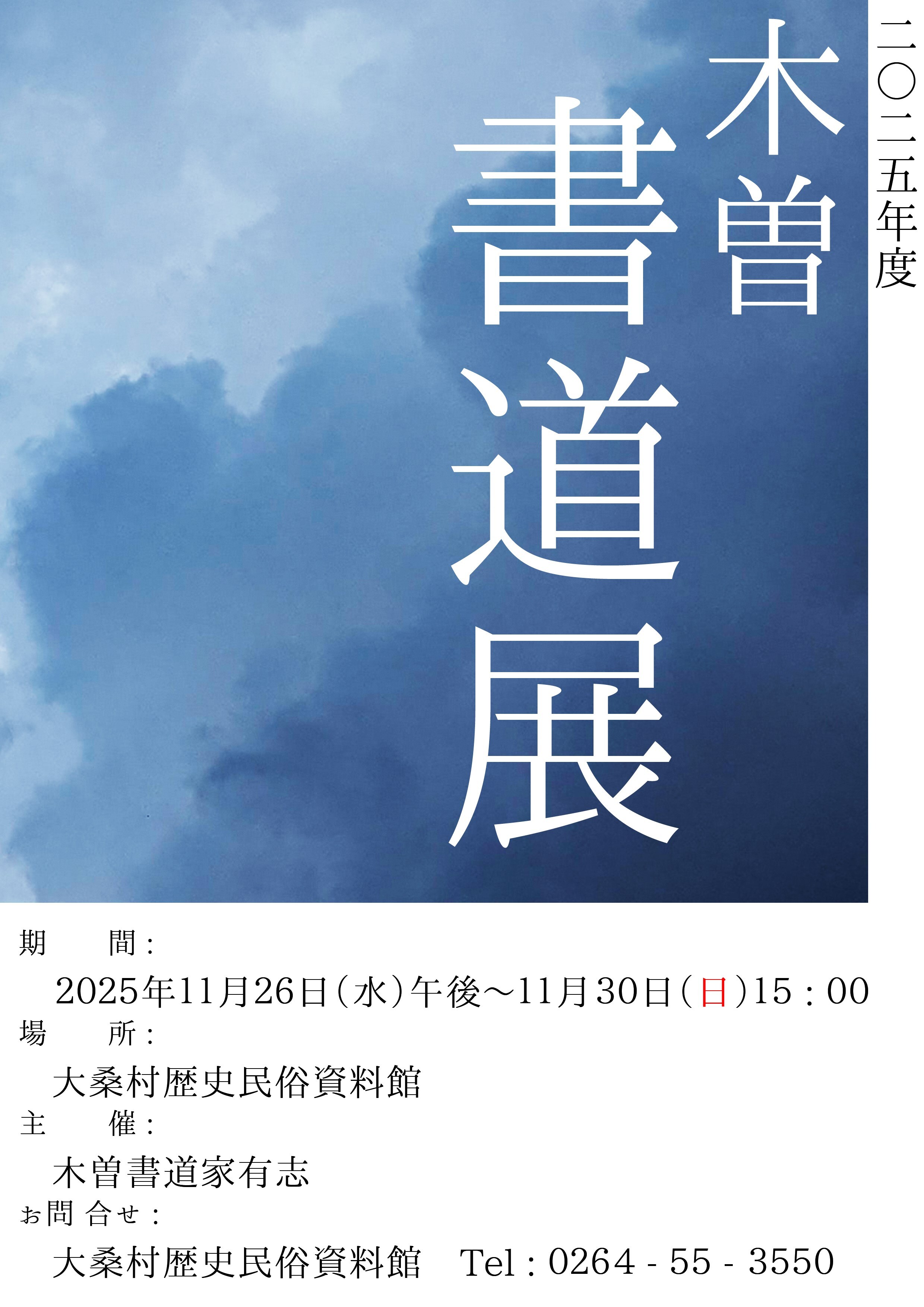 | 木曽書道展 | 2025年11月 | 木曽の書道愛好家の皆さんによる書道展です。 | チラシ(713.7kbyte) |