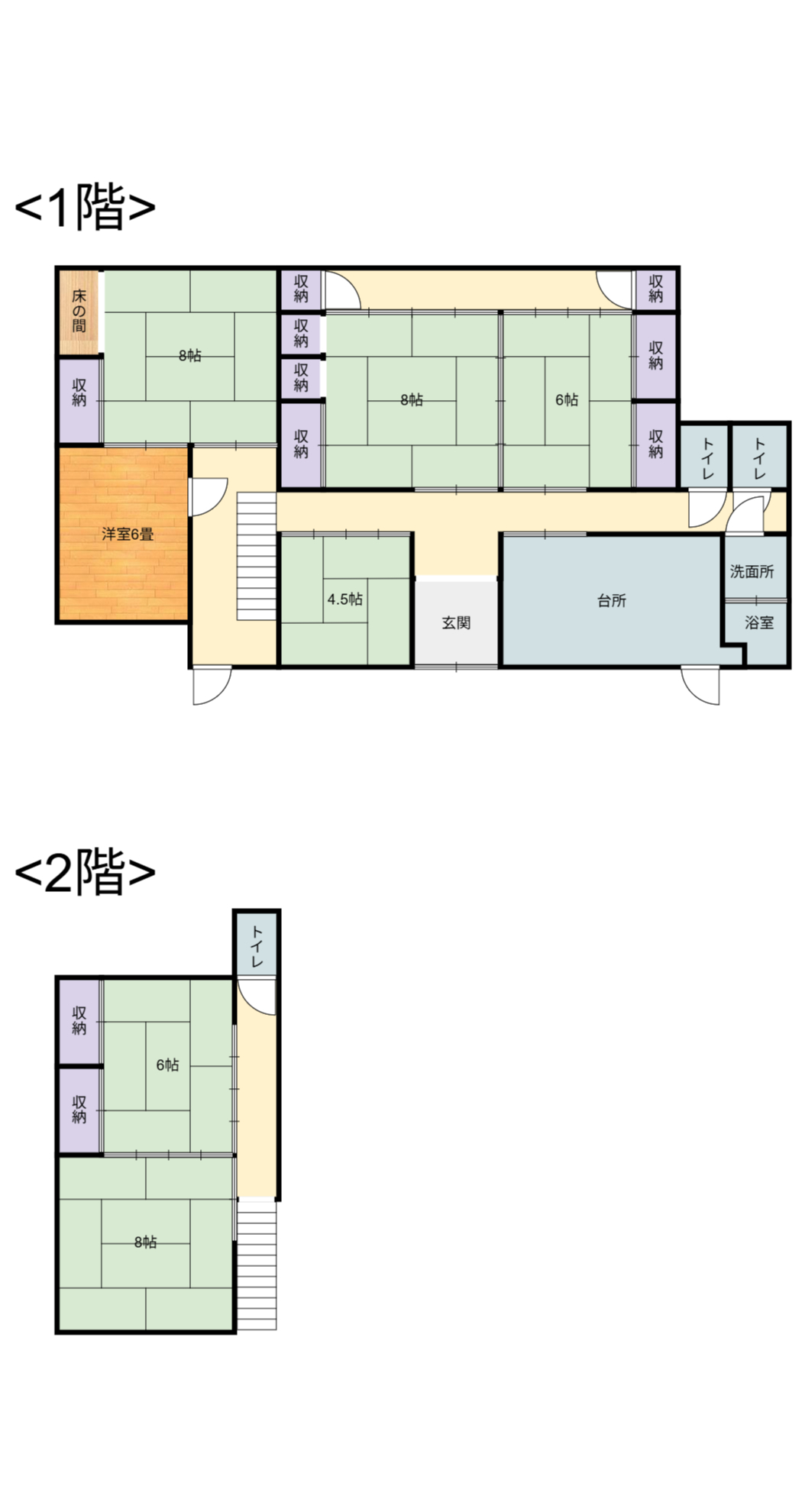 - 1階:和室4部屋、洋室1部屋、台所、風呂、トイレ